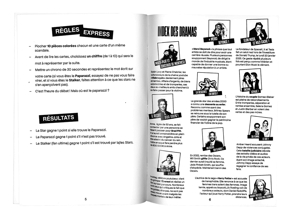 Scandal! est un jeu basé sur les scandales des stars. Conçut en 1 semaine, ce jeu devait impliquer du bluff, du materiels créatif et de la correspondance.