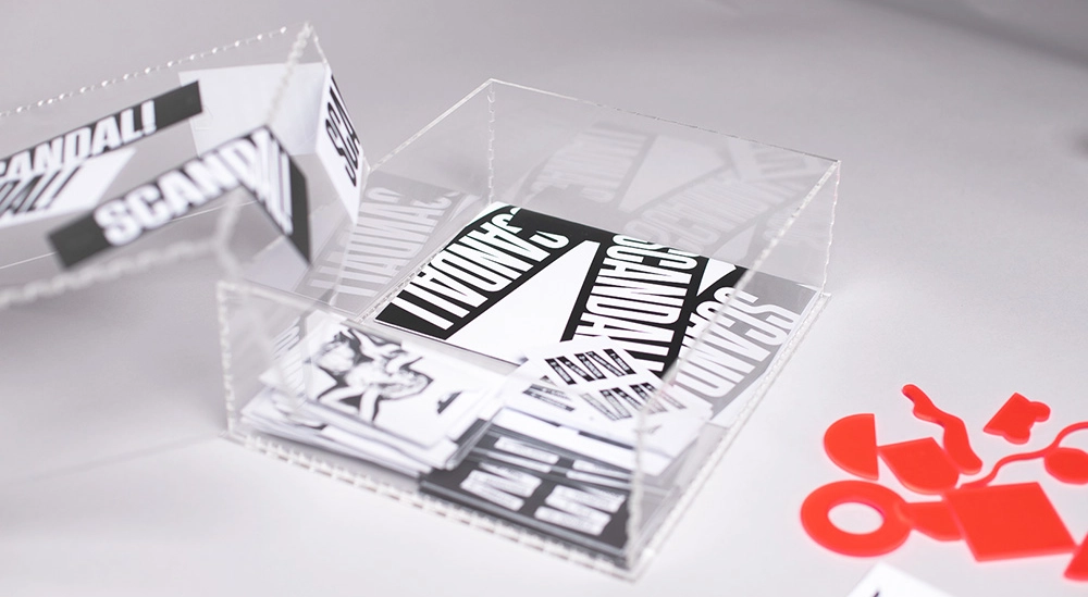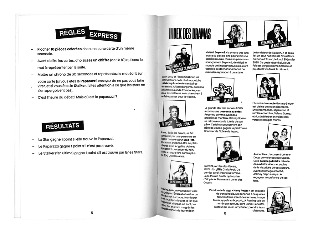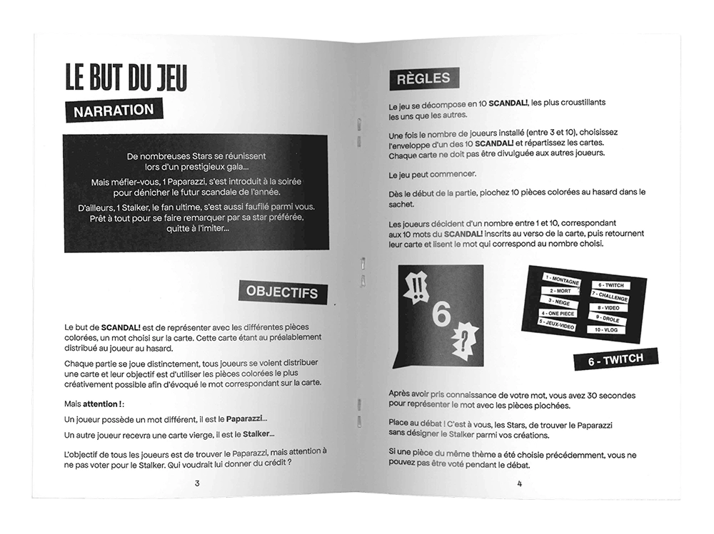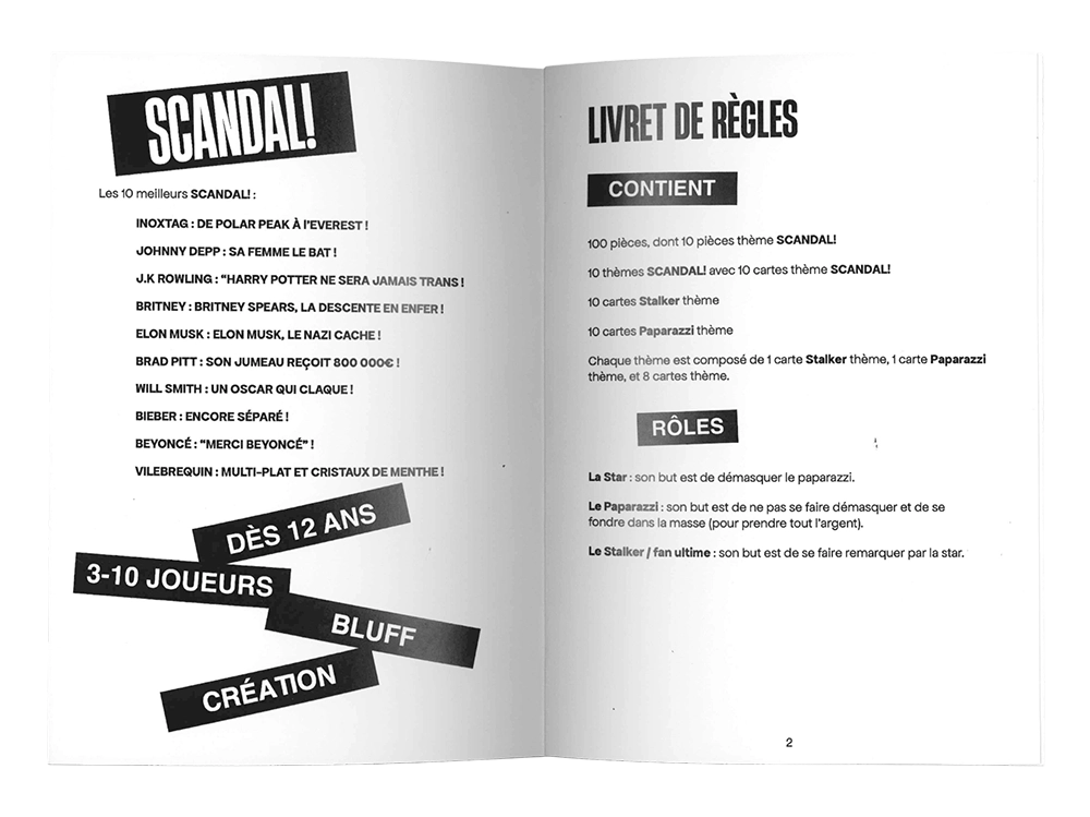 scandal! est un jeu basé sur les scandales de stars. conçut en une semaine, ce jeu devait contenir bluff, du matériel créatif et de la correspondance. ce jeu est répartie en plusieurs catégories/stars tels que Justin Bieber ou bien inoxtag. les joueurs doivent représenter des mots à l'aide de formes abtraites afin de démasquer les imposteurs.